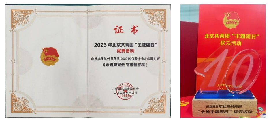 在北京共青团开展的“十佳主题团日”和“团建百强”品牌项目评选活动中,2020级信管专业2班团支部开展的“永远跟党走奋进新征程”主题团日活动获评2023年北京共青团“主题活动”优秀活动。