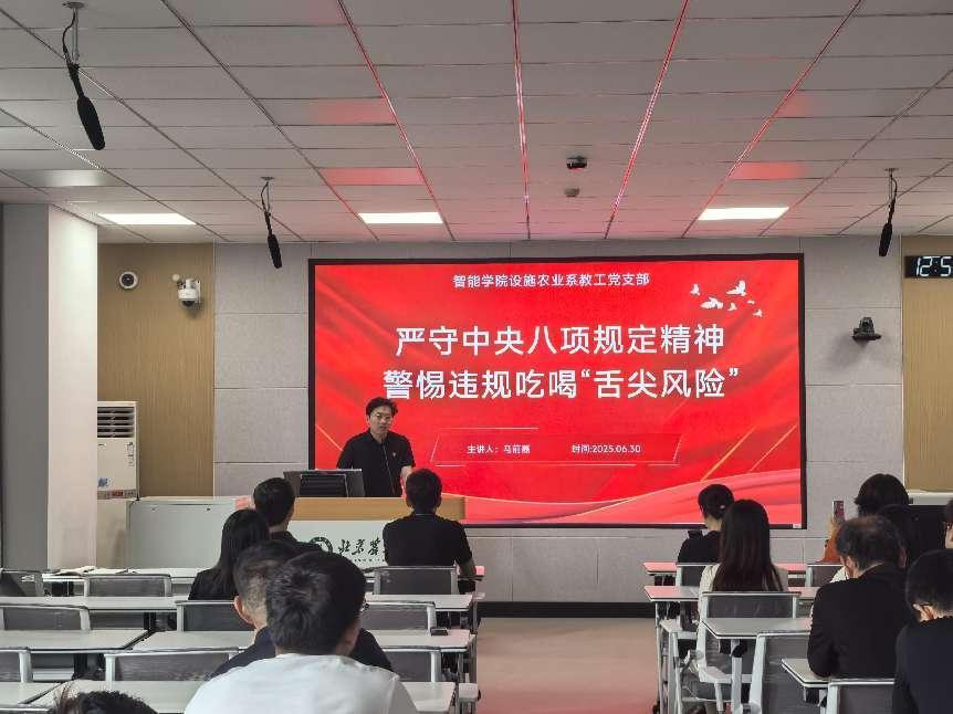 yl7703永利设施农业系教工党支部书记马前磊聚焦于严守中央八项规定精神,以警惕违规吃喝“舌尖风险”为主题开展党课。他紧密联系教师的教育工作以及员工的日常行为,通过生动详实的案例,深入剖析了违规吃喝现象的危害性,解读了整治违规吃喝的各项规定,为党员们敲响了廉洁自律的警钟,引导大家在教育一线和日常生活中自觉抵制不良风气,树立清正廉洁的良好形象,切实履行好教书育人、为人师表的职责使命。