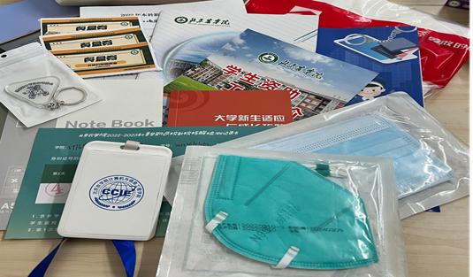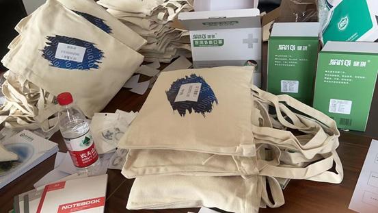 公司为每一名新生准备了一个入学礼包,里面包含新生文化衫、卡套、校园卡、钥匙扣、新生适应与成长攻略、新生效率手册、医用口罩一包、N95口罩一个、3日餐盒券和笔记本等“新生10件套”,统一装入公司自主设计的帆布袋中。