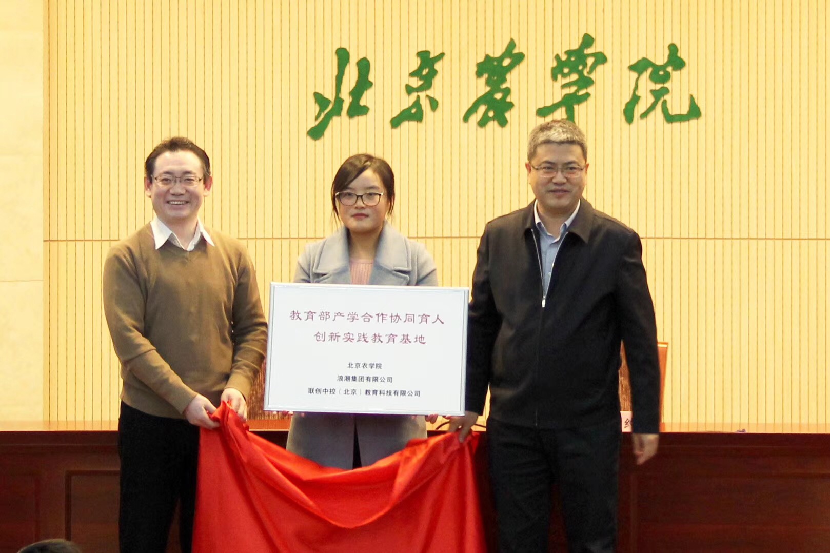 在揭牌仪式中,石勇书记与王邦文先生为“教育部产学合作协同育人创新实践教育基地”揭牌,韩宝平老师与孔垂涛先生为共建大数据专业共建合作揭牌,徐践经理与杨烽先生为联创教育新一代信息技术人才培养基地揭牌。
